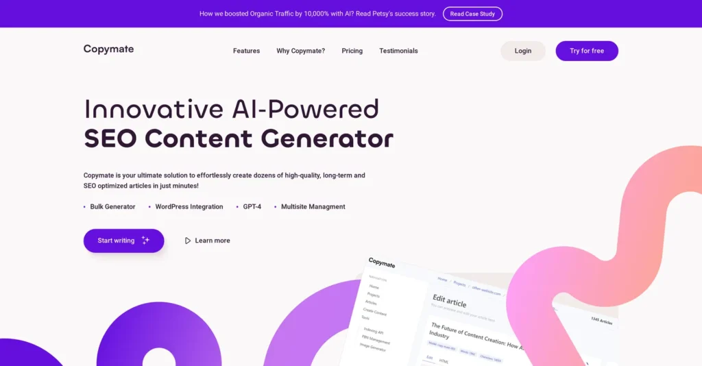 Copymate’s combination of bulk generation, GPT‑4, WordPress publishing, and multi-language coverage provides an all-in-one content engine for scale. It packs advanced AI tools like image generation and NeuronWriter integration for seamless SEO workflows.