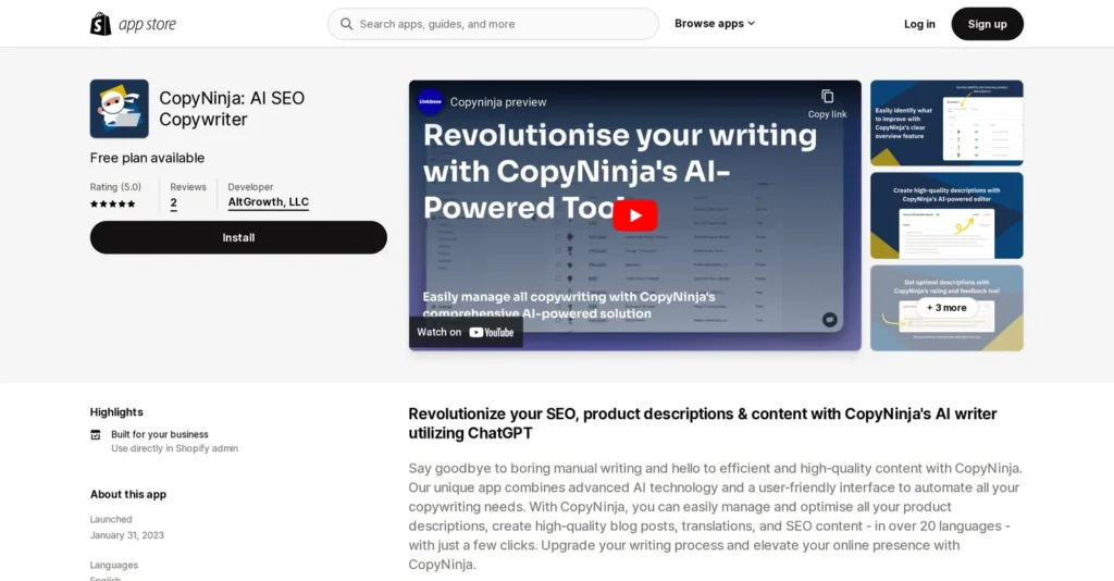 CopyNinja is an AI-powered Shopify app that automates the creation of SEO-optimized product descriptions, blog posts, titles, and metadata. Powered by GPT-3.5 and ChatGPT, it helps merchants scale content creation in over 20 languages directly from their Shopify dashboard.