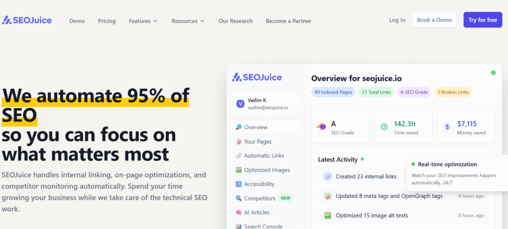 SEOJuice combines AI-driven insights with advanced SEO tools to provide businesses with a comprehensive solution for improving website performance. From keyword research to competitor analysis, it helps businesses scale their SEO efforts efficiently.