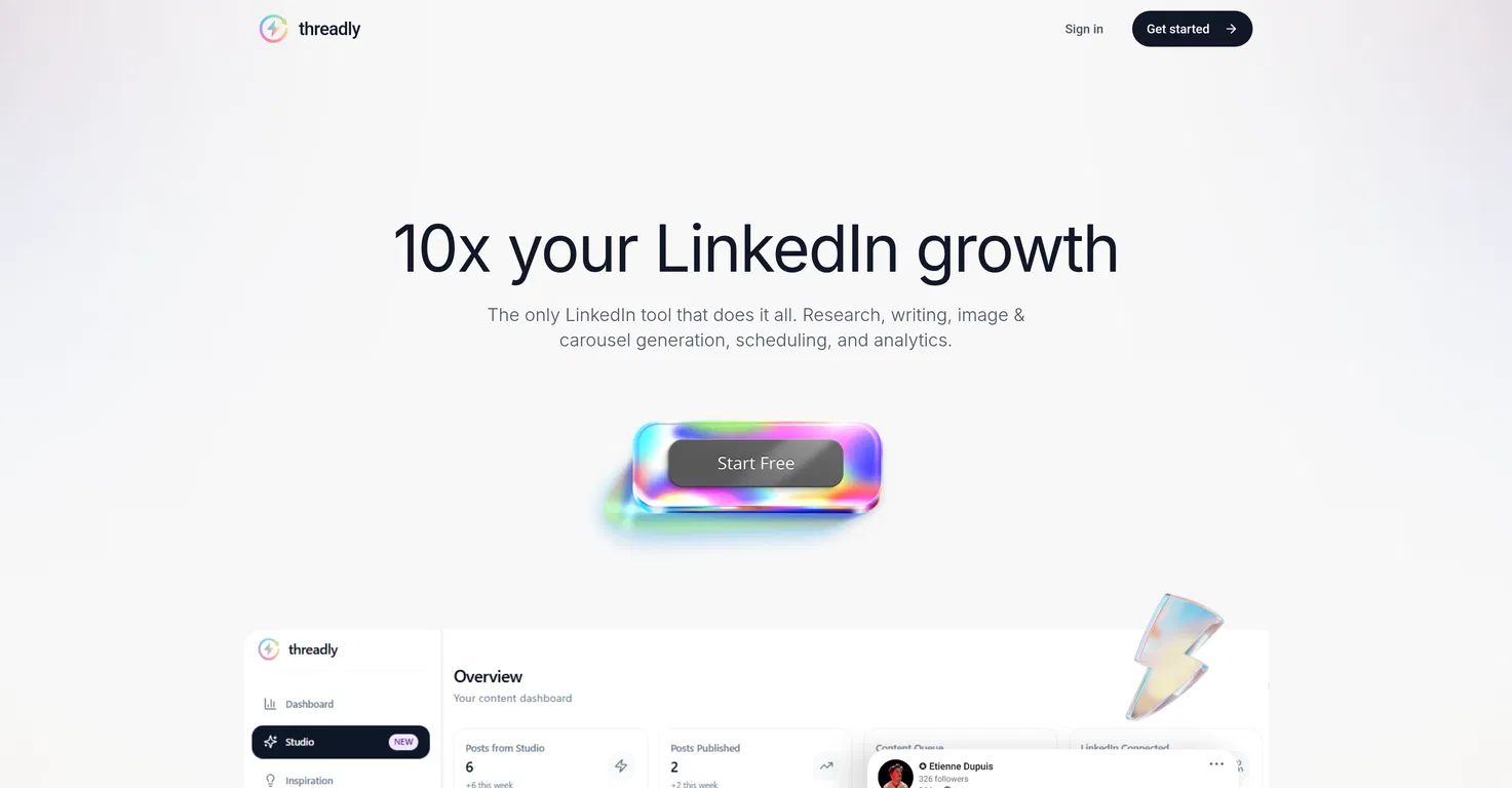 ThreadlyApp.co stands out by focusing exclusively on LinkedIn content: post & carousel generation, voice/style matching, scheduling and performance tools — all oriented toward helping professionals grow their LinkedIn influence efficiently without having to juggle multiple content tools.