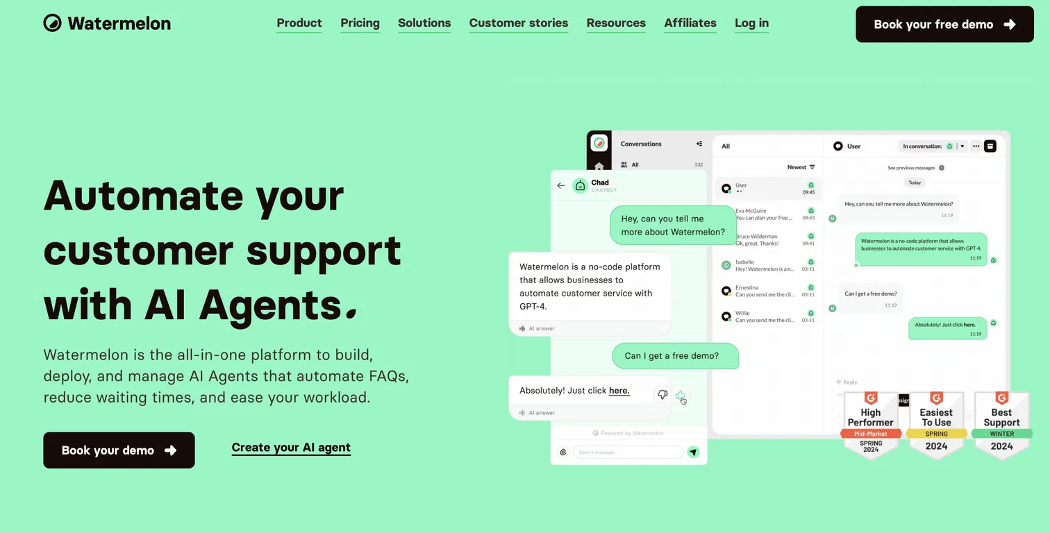 Watermelon empowers businesses to deploy highly functional AI agents without any coding knowledge. Its focus on ease-of-use, multilingual support, and native integration makes it a powerful choice for fast-growing teams.